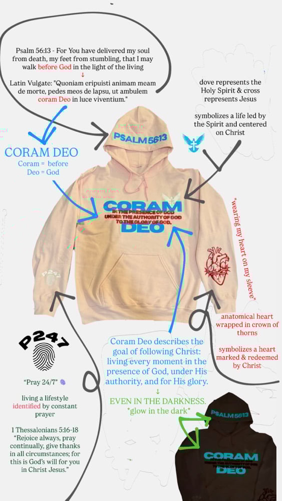 Coram Deo is a Latin phrase that means before the face of God. This hoodie is inspired by Psalm 56:13 and the idea of walking before Him in the light of the living. The design reflects identity, reverence, and the call to live every part of life with awareness of His presence. Made to be both meaningful and bold, this piece combines symbolism with a modern streetwear style and a unique glow in the dark twist.